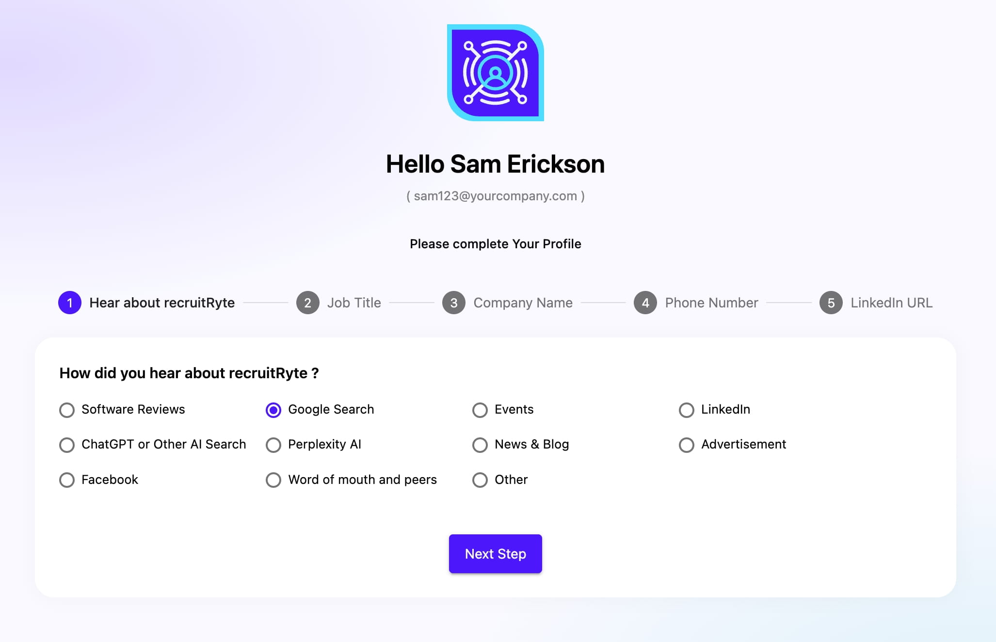 - Continue Setup: After entering the correct code, you’ll automatically proceed to complete your profile and begin using recruitRyte.