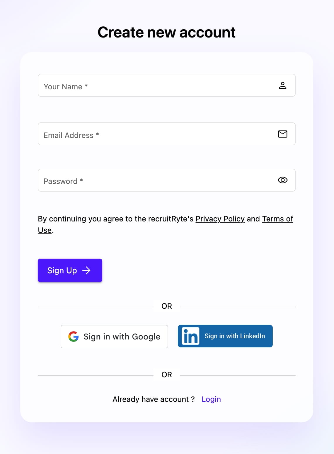 To get started with recruitRyte, click “Sign Up” (or “Login”) in the top-right corner of the screen.