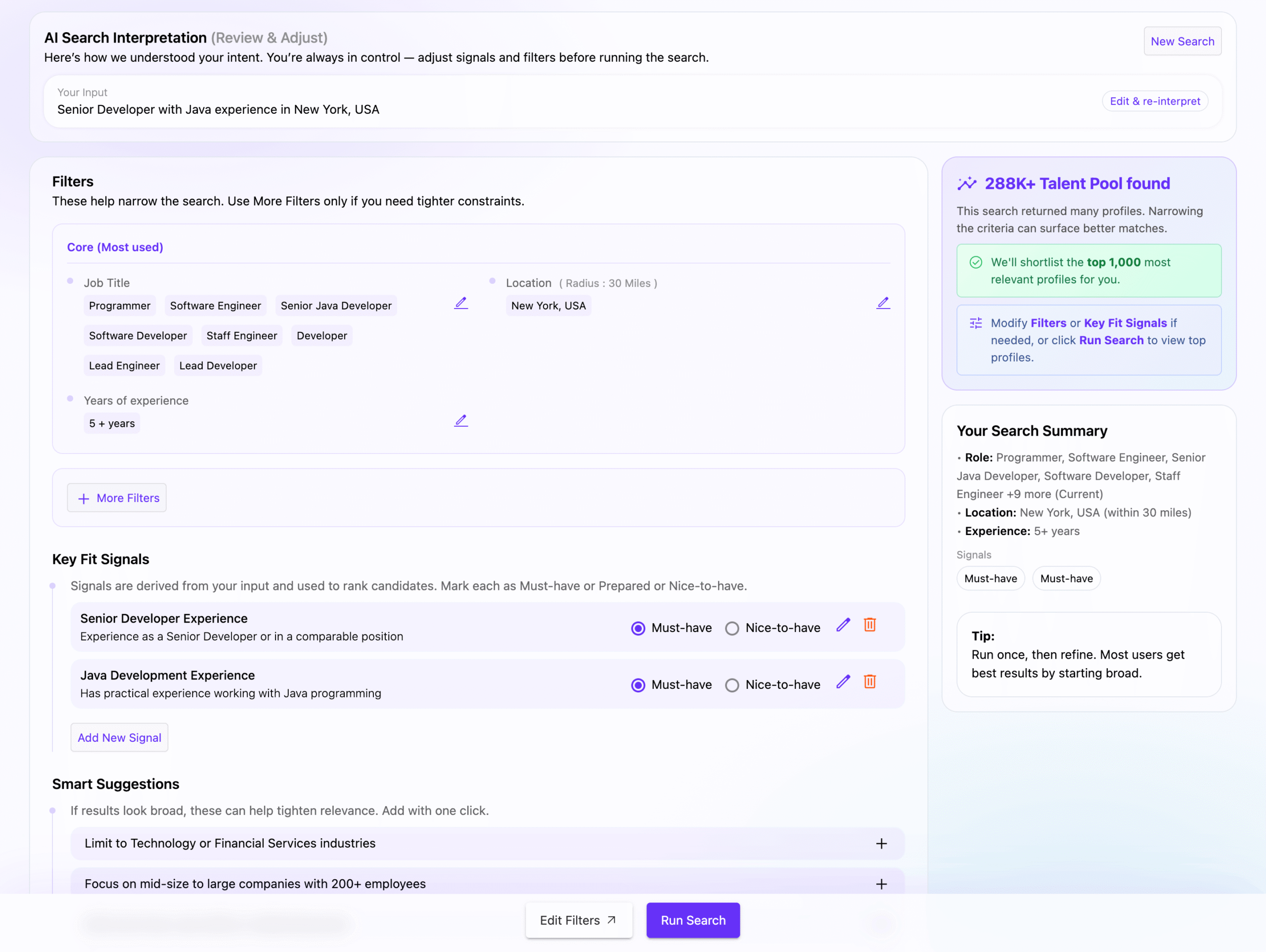 - Enter your search in natural language (e.g., “Senior Developer with Java experience in New York, USA”)
