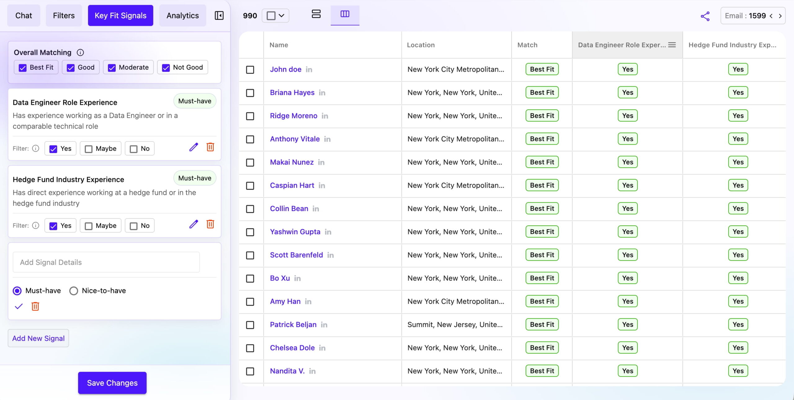 | Left Panel (Signal Controls) | Shows your signal configuration with Overall Matching filter and individual signal cards with Yes/Maybe/No filters. | Adjust filters to dynamically update the candidate list in real-time. |