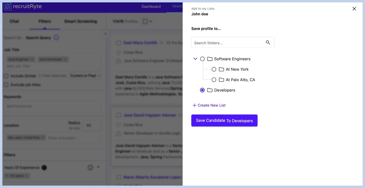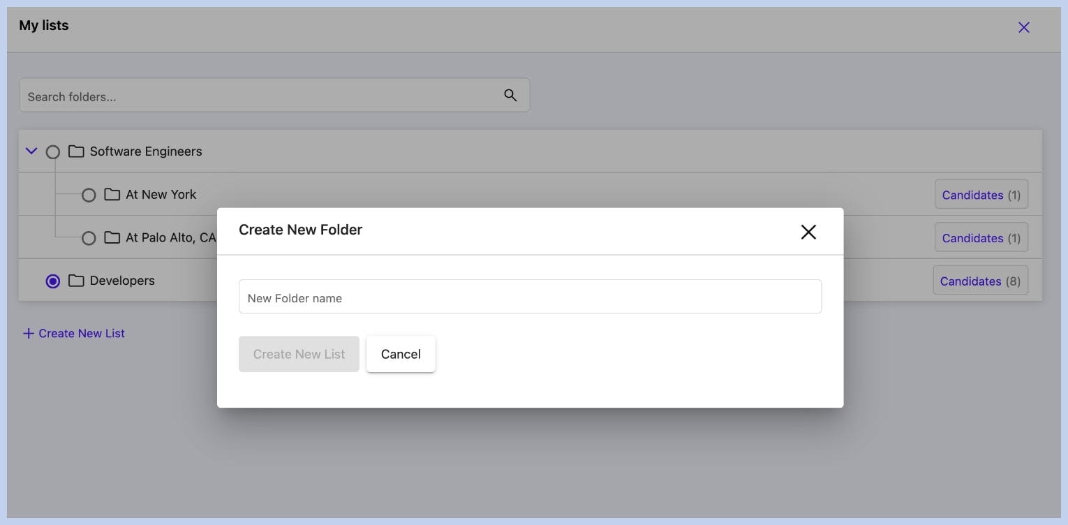 - Search or Select: Search for an existing list or check the folder/list where you want the candidate saved.
