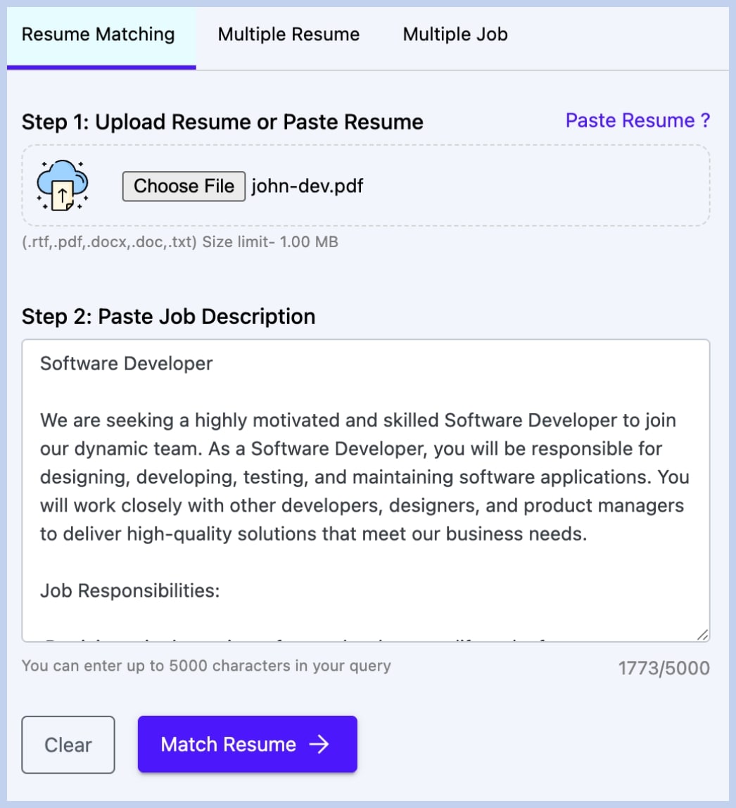 - Upload Resume: Click Choose File and upload a PDF, DOCX, or similar file. The system automatically parses the text.